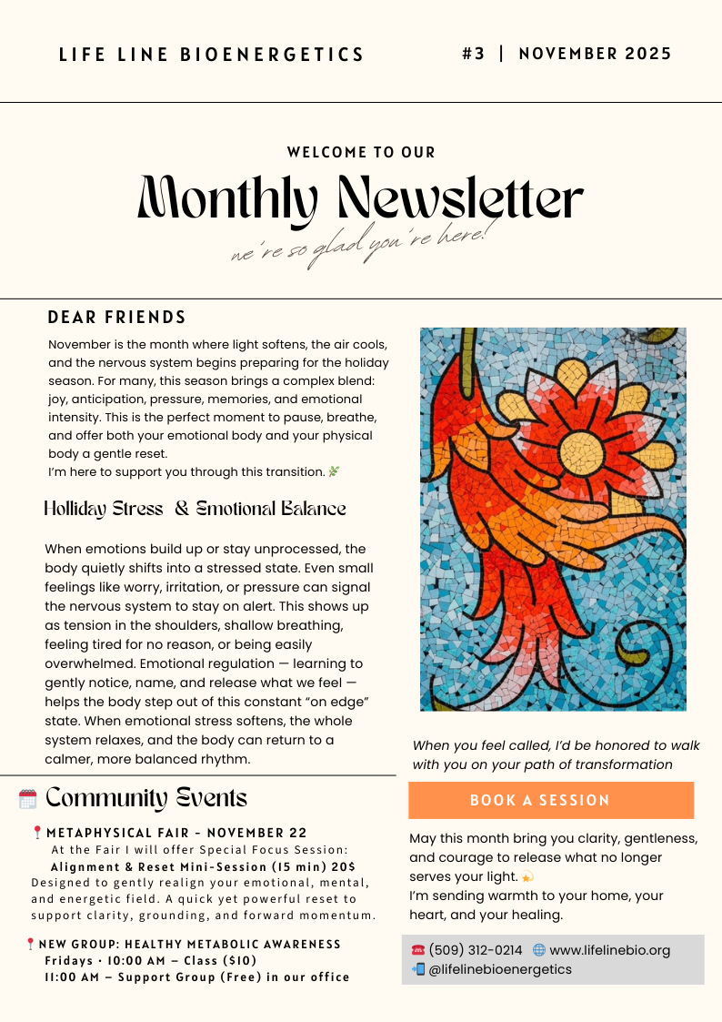 November is the month where light softens, the air cools, and the nervous system begins preparing for the holiday season. For many, this season brings a complex blend: joy, anticipation, pressure, memories, and emotional intensity. This is the perfect moment to pause, breathe, and offer both your emotional body and your physical body a gentle reset.